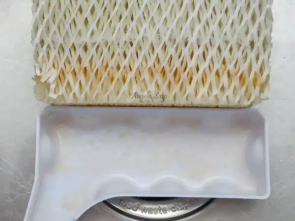 - See the nastiness in the filter? That is why you want to throw it away and get a new filter every season. You can see the water tray has some mildew build up in it. Fill it with straight vinegar or a bleach solution to disinfect.